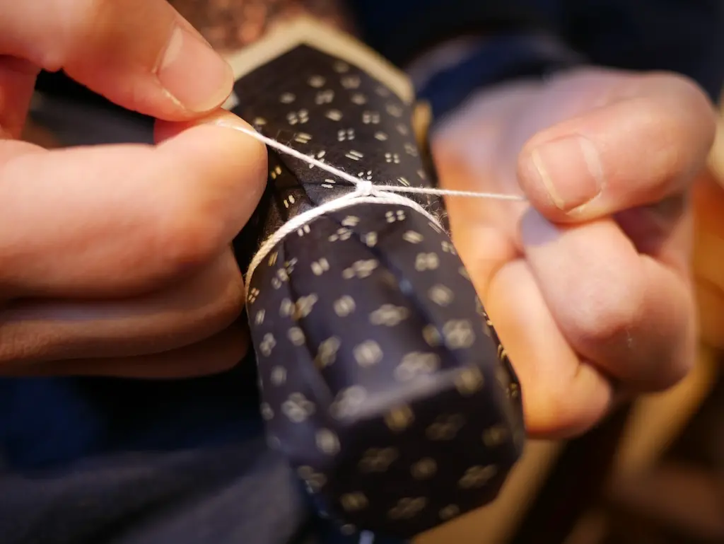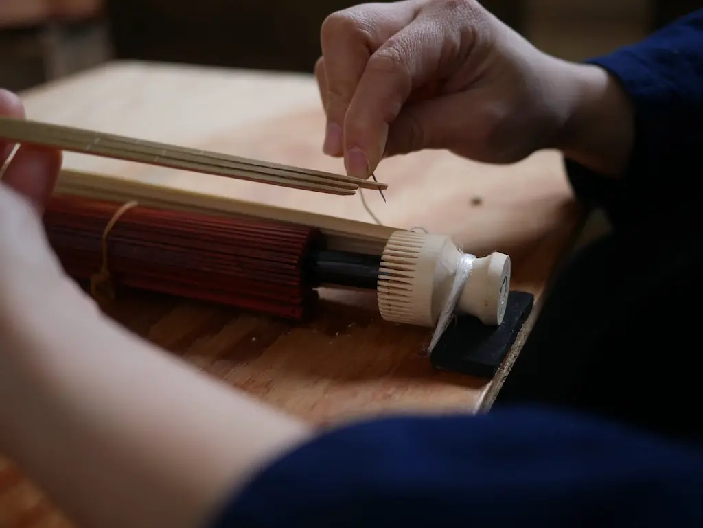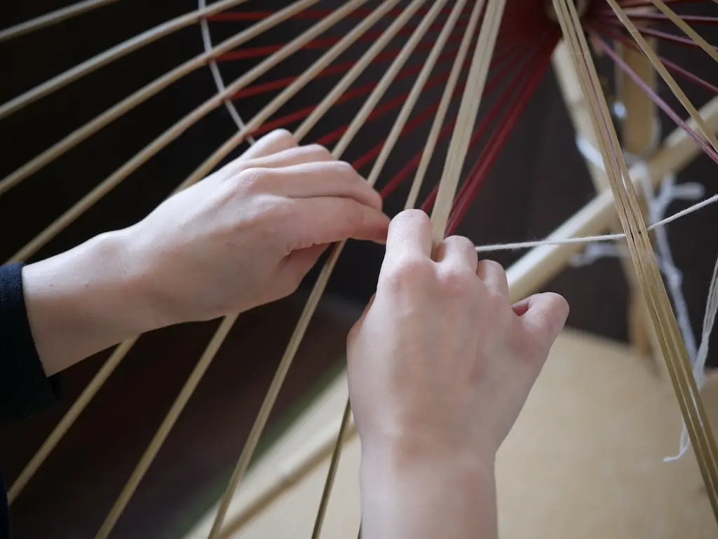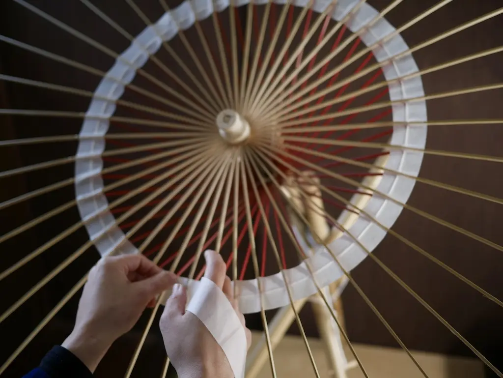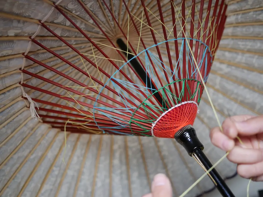 The bamboo ribs and rokuro (the mechanism that opens and closes the umbrella) are then connected and tied together with thread.