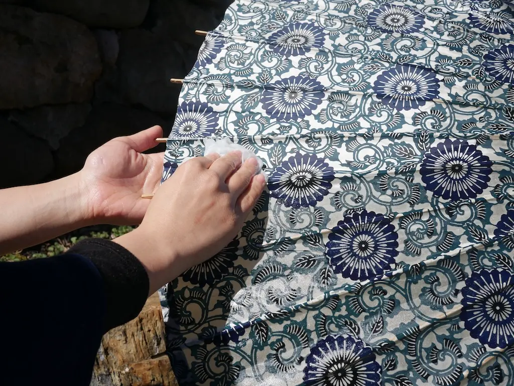 Using a brush, paste is carefully applied only along the ribs, and the washi is meticulously laid by hand with the help of various tools. Afterward, the umbrella is left to dry for an entire day before being folded.