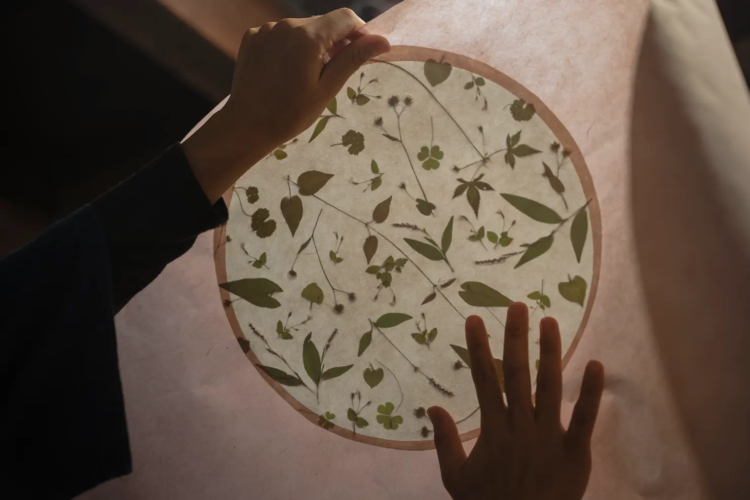 和傘に貼り付ける和紙と糸をお選びいただきます。和紙は石川県北部の中能登で作られたものを使用し、本物の葉を漉き込んだ漉き込み和紙が数種類ございます。お好みの組み合わせを選び、世界に一つだけの和傘を作ります。