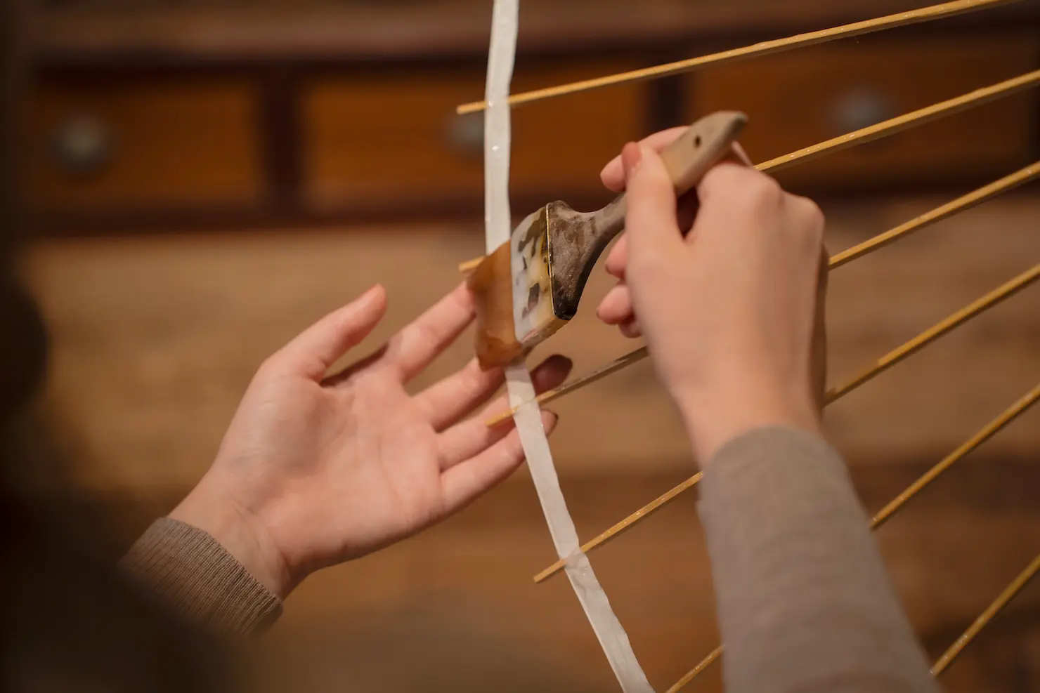 Use our own handmade paste to carefully attach the washi paper to the wagasa’s frame.