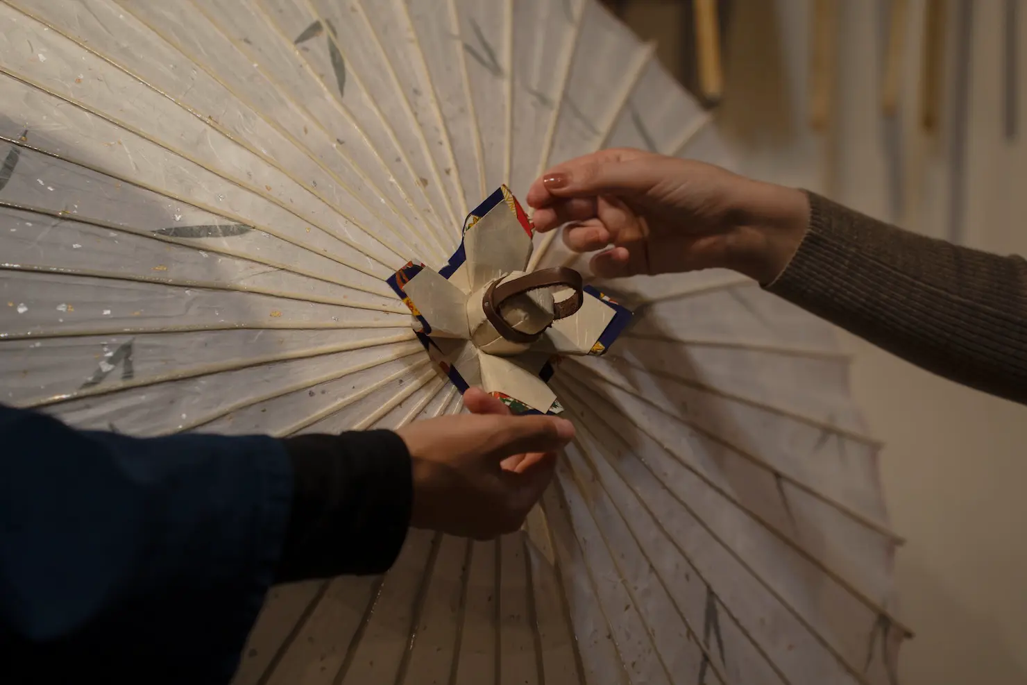 You’ll begin by selecting the washi paper to be applied to your wagasa. We use handcrafted washi made in Nakanoto, in northern Ishikawa, including several unique varieties that are embedded with real leaves. By choosing your favorite combination, you’ll create a one-of-a-kind wagasa found nowhere else in the world.